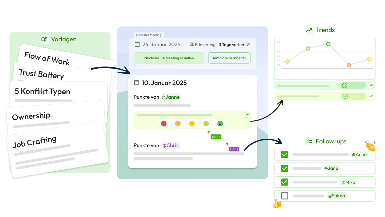 Man bezahlt also für die 1-zu-1-Meeting-Software nur für Führungskräfte und nicht für Mitarbeitende.