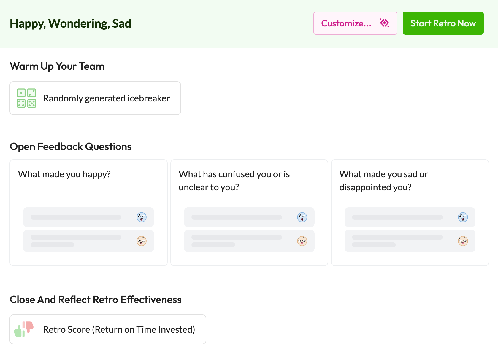 | "What went well" Retro | Glad / Sad / Mad Retro | 4L-Retro | Sailboat Retro | Retro battery | Spotify Health Check Retro | |
